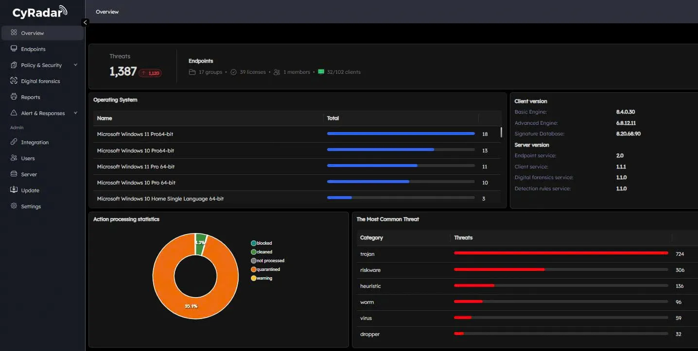 CyRadar EDR’s administration dashboard including OS statistics, threat counts, mitigation status, and common threat categories, enabling centralized management for enterprises