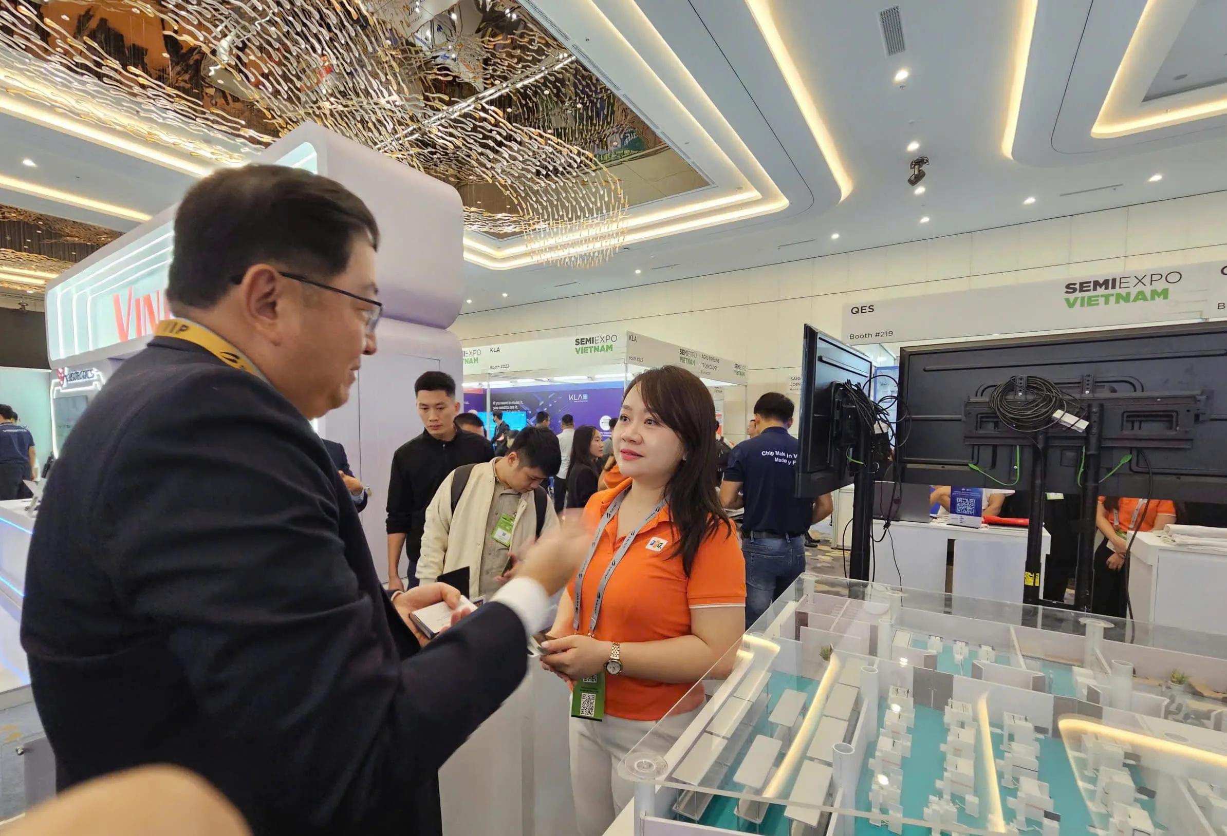 Visitors explore FPT’s exhibition booth featuring Vietnam-designed chip products and semiconductor talent development solutions.