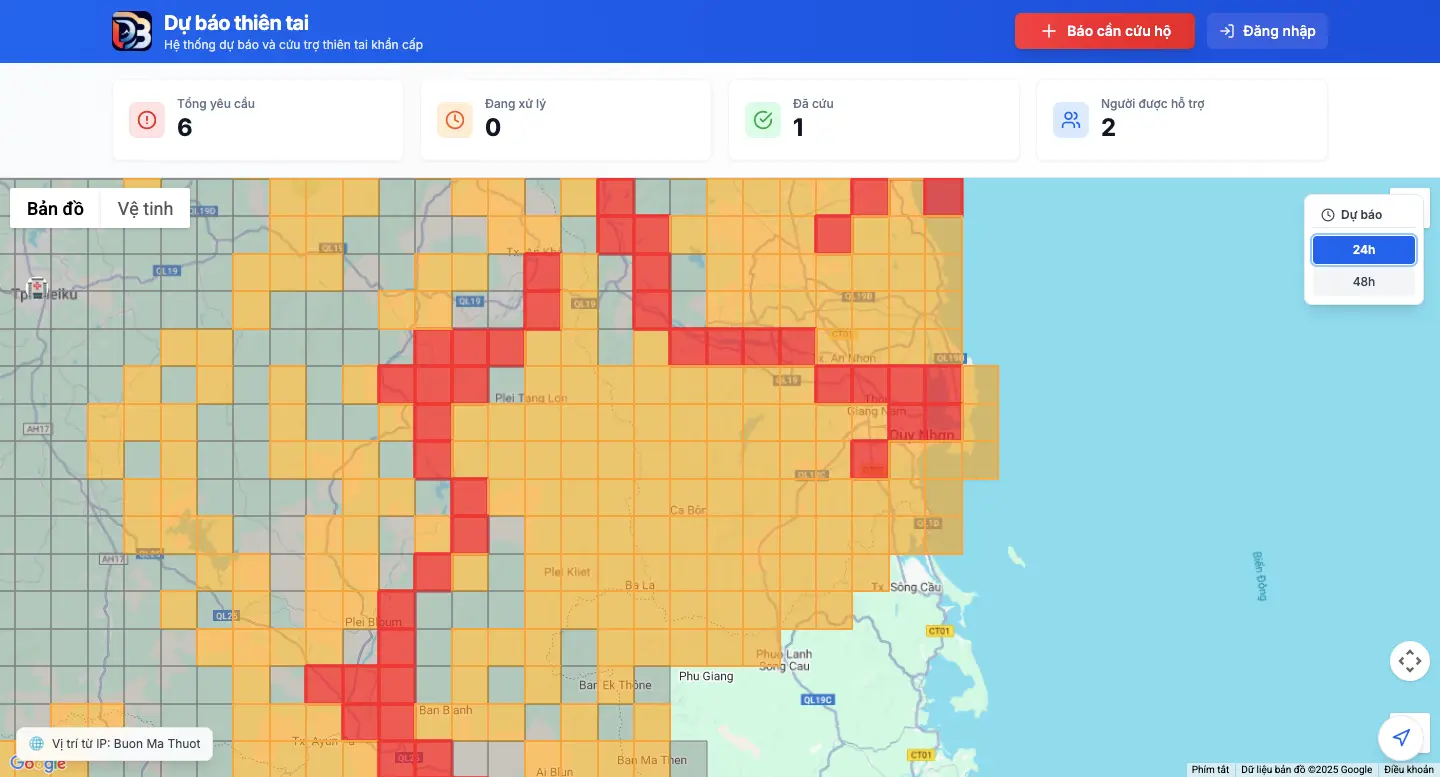 The system is currently generating accurate forecasts for Gia Lai, and the team is expanding coverage to additional affected provinces while improving model precision. The website is lightweight and minimalistic, designed to function smoothly even under weak network conditions—a critical factor during natural disasters. The platform is provided entirely free of charge.